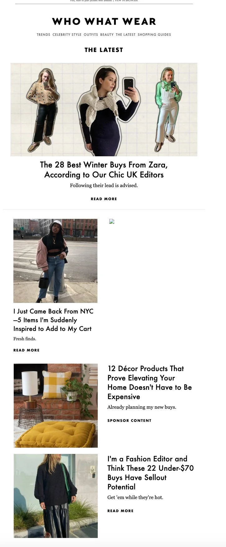 At Who What Wear, I managed the full funnel email marketing efforts for the WWW UK editorial and ecommerce audiences. This consisted of slating daily editorial and ecommerce newsletters, analyzing data to optimize emails and flows, crafting subject lines, and working on our lifecycle flows and segmentation.